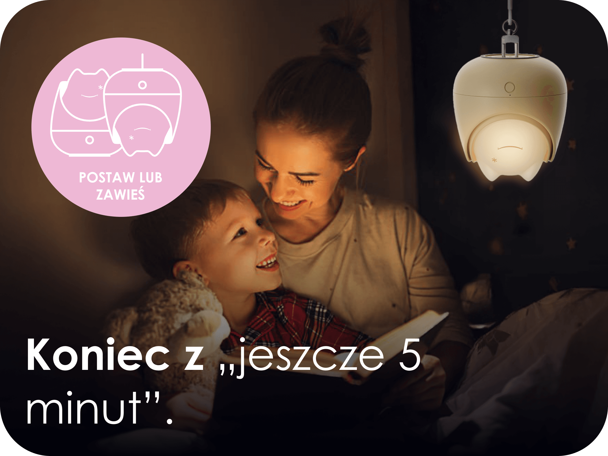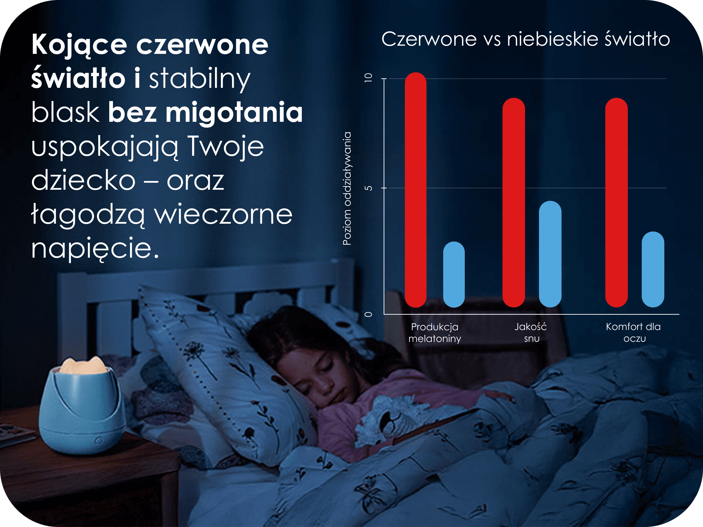 Delikatne, stopniowo gasnące światło imituje zachód słońca, pomagając dziecku naturalnie się wyciszyć i łatwiej zasnąć.