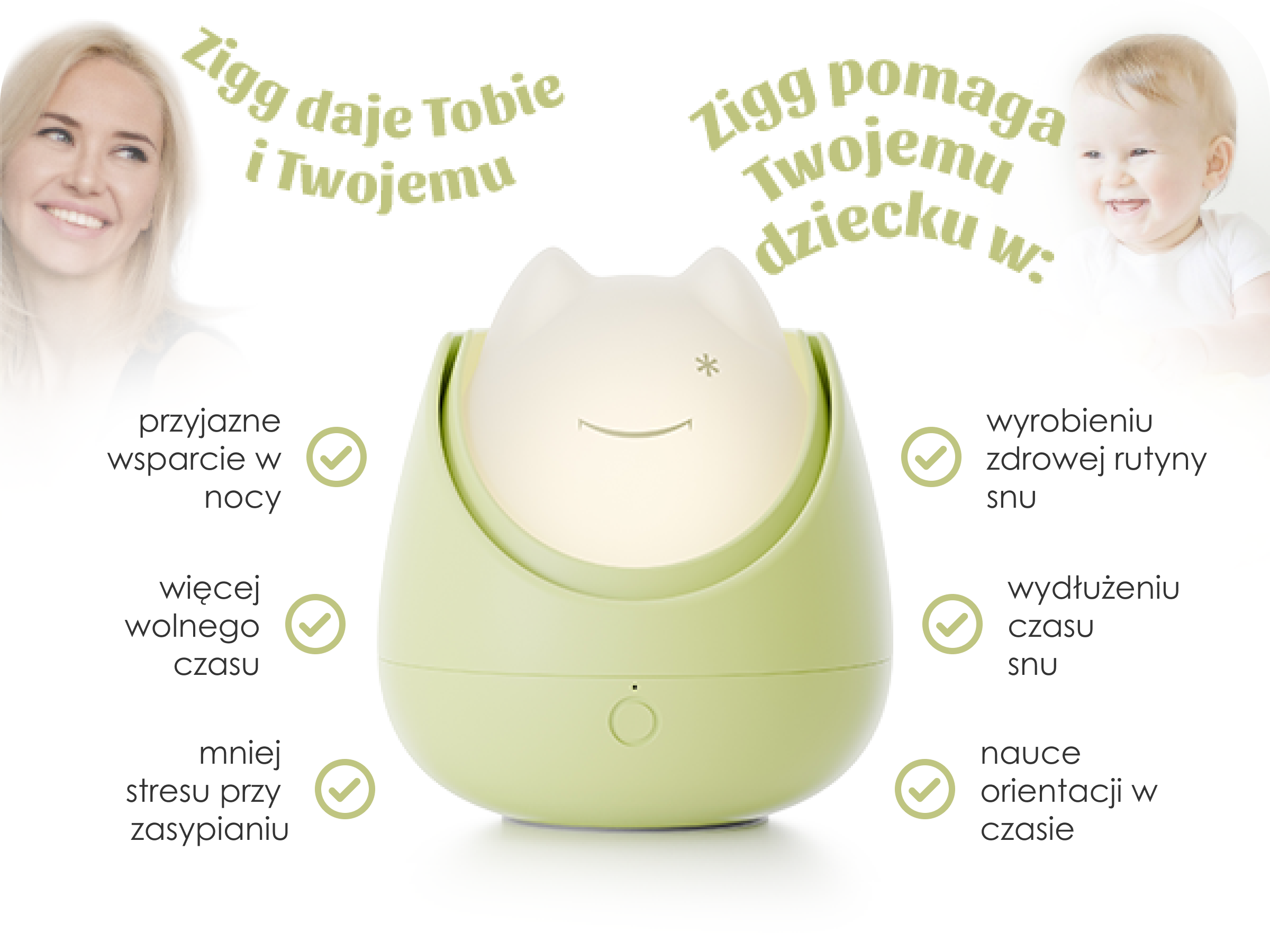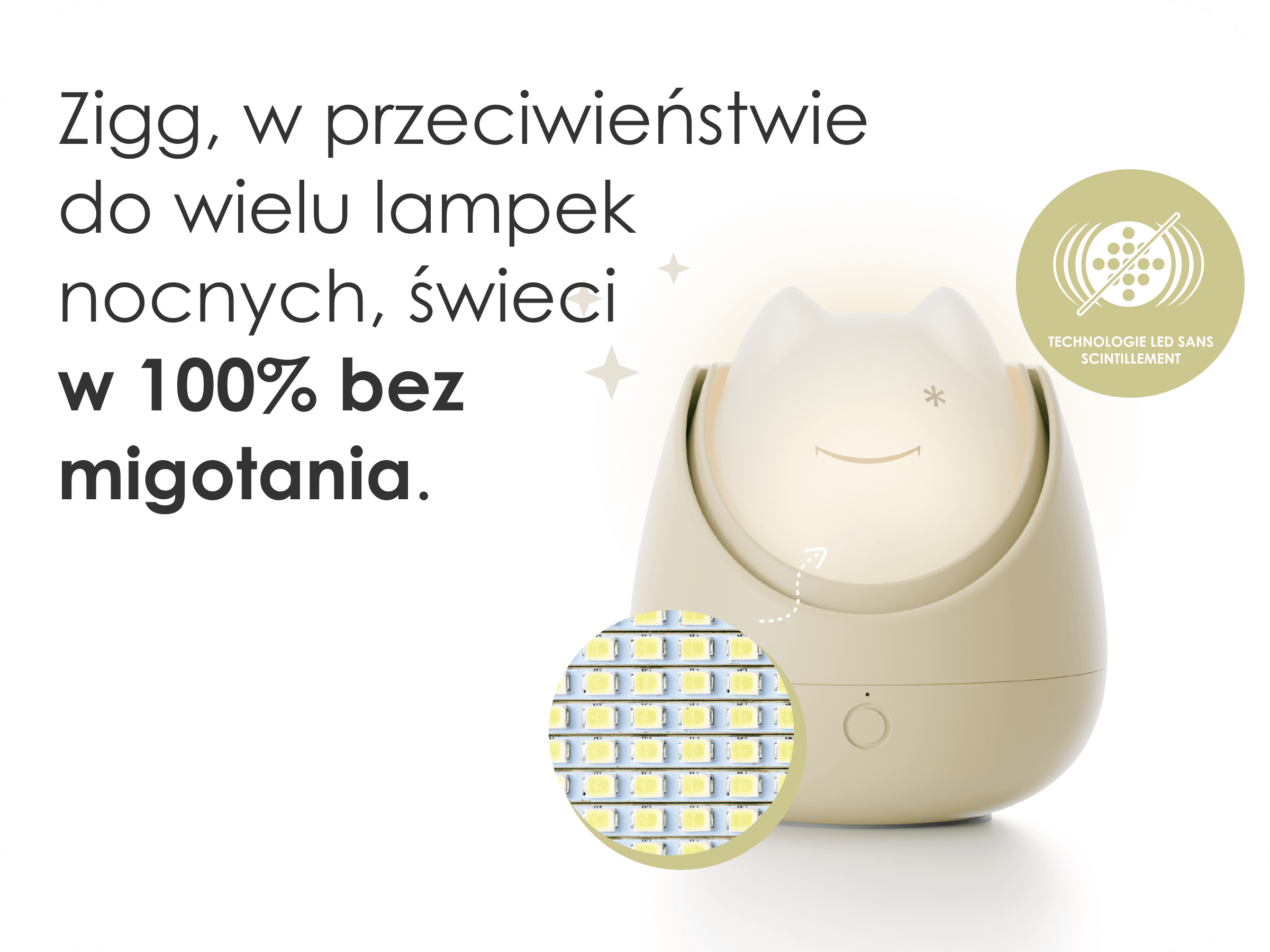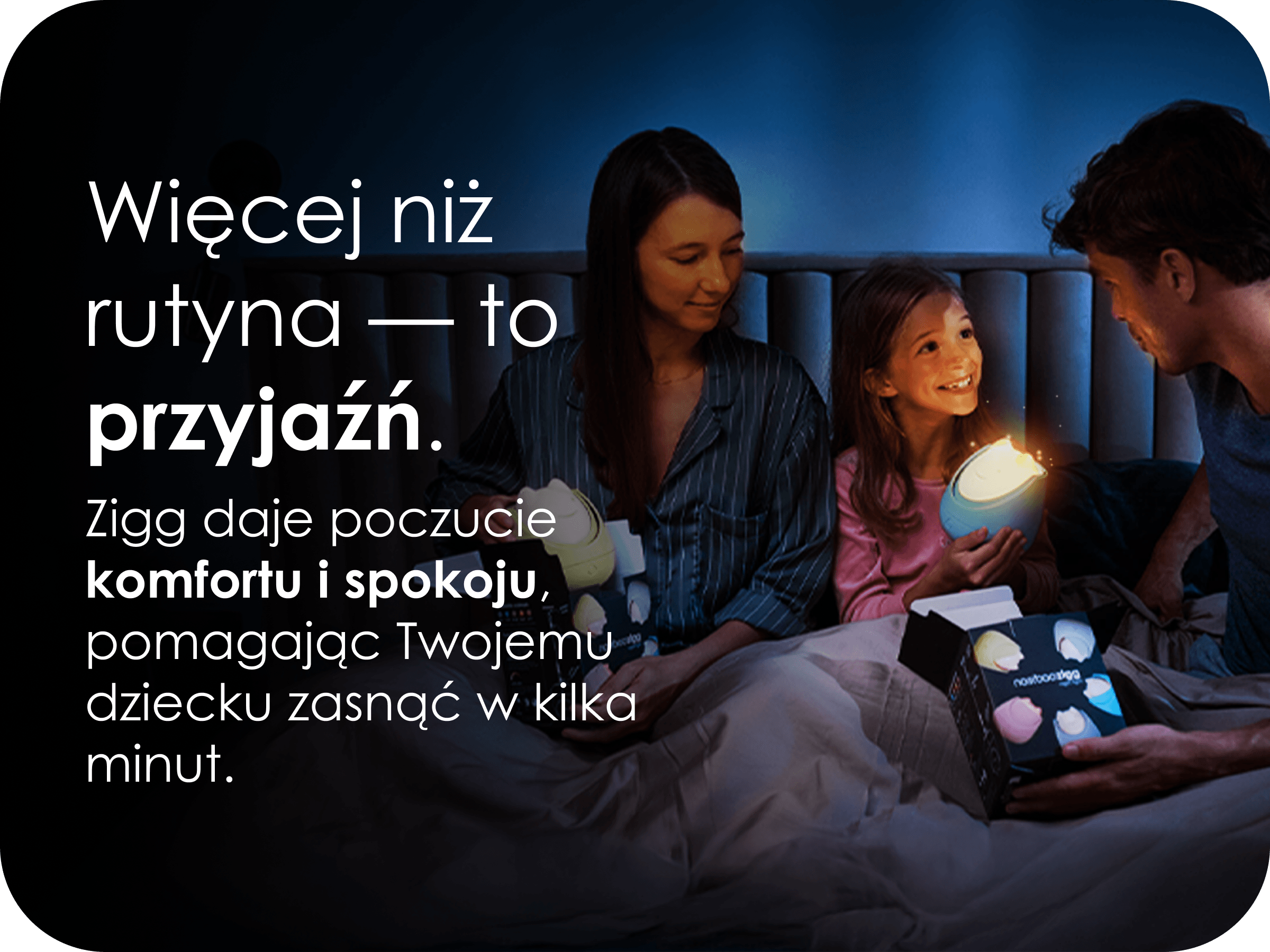 Zigg korzysta z inteligentnych ustawień, które przyciemniają światło i wspierają zasypianie – bez potrzeby Twojego udziału.